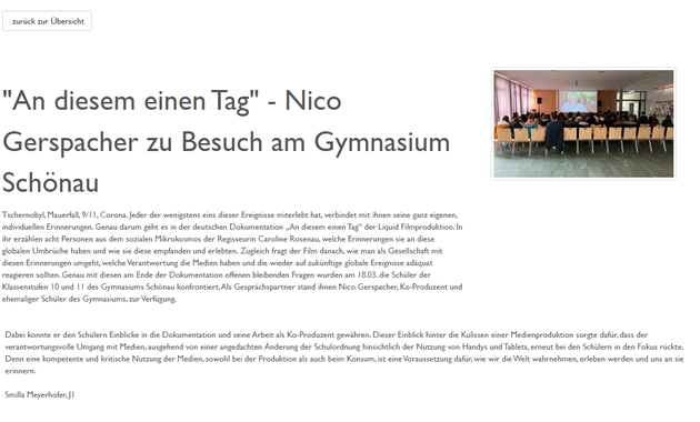 Bericht zur Filmvorführung von AN DIESEM EINEN TAG am Gymnasium Schönau