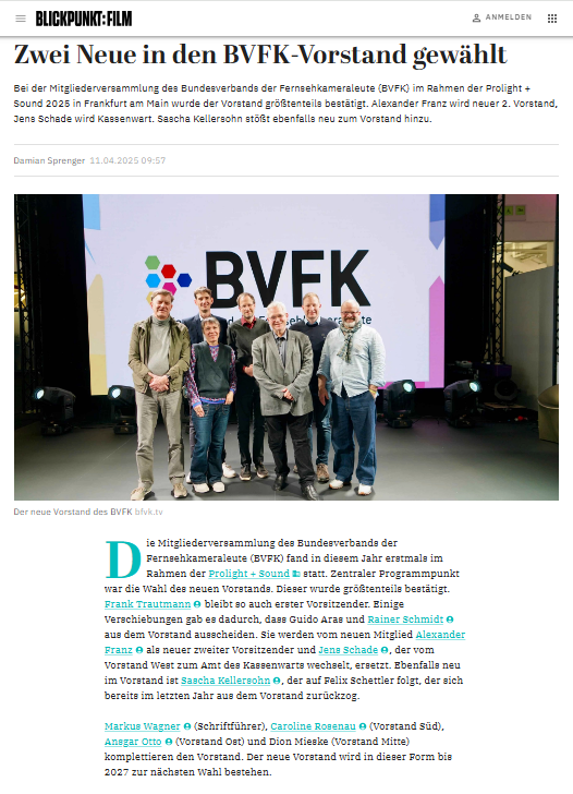 Im April wurde im BVFK der Vorstand in Frankfurt auf der Prolight & Sound gewählt. Mehr dazu im Artikel. Link dazu findet ihr hier: Zwei Neue in den BVFK-Vorstand gewählt | TV | Blickpunkt:Film
